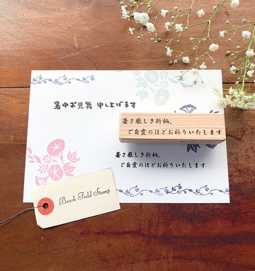 一組包含大金魚、小金魚與水草三款印章。【木頭底座尺寸】「在炎熱的時節,請多保重身體」適合搭配「暑期問候」印章一同使用。此為簡約的行書字體印章。【尺寸】縦1.8cm橫7cm【使用墨水】(不包含墨水)VersaMagic (小尺寸稱作 Dew Drop) Midnight Black