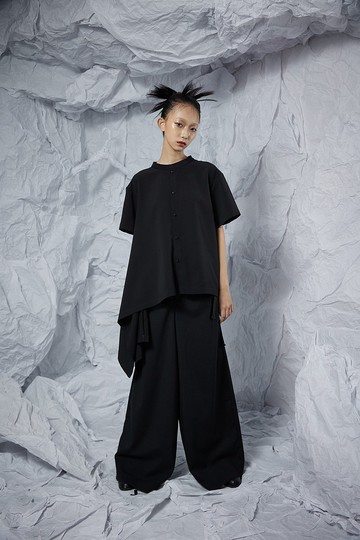 **2022SS TRANSLATE**https://images.squarespace-cdn.com/content/v1/568d0036dc5cb4a5b51b342a/8f5f383a-5a7c-4c5f-8ef6-b6e9ba92e881/INF+22SS+TRANSLATE.png?format=1500w|**靈感**|靈感來自翻譯與轉換的概念,”將2D翻譯(轉換)成3D,人翻譯(轉換)成魂,恨翻譯(轉換)成愛”;透過翻譯與轉換,讓我們學習到從不同的角度去看待事物,一個事件的本質並不是那麼絕對,而在翻譯與轉換的過程中我們也獲得了一些意外的收穫,不同於生活中的小確幸,而是學習用一種更為宏觀、豁達的角度去看待世界。細節取樣自台灣早期地方信仰與本土妖怪等元素,並與今年12月即將重新登上院線 - 最知名國產動畫-《魔法阿媽》聯名,使用劇中角色酷羅(貓)、小扁(蛇)、Apple(抱著娃娃的小女孩靈魂)等做為素材,並致敬電影剪輯技術「蒙太奇(Montage)」,將角色以拼貼手法融合民俗信仰中畫符的手寫筆觸,打造出滿版且多彩的服飾印花。除了透過時裝展現出台灣在地信仰文化與台灣早期的風土民情外,本季也使用將2D變3D的「Trompe L’oeil」(錯視畫法)的繪畫技法,不斷觀察生活中時裝的光影變化,並以深淺不同的平面色塊重新描繪出《魔法阿媽》劇中角色般的明暗與細節,並運用於服飾印花上,整套服裝穿上後,宛如從動畫中走出的人物一般,看似平面(2D)又看似立體(3D),呼應了品牌本季主題 Translate,翻譯、翻轉出夾藏在平面與立體之間2.5D的韻味,創造出本季富含個性亦帶點可愛氣息的都會時尚印花。 INF品牌不斷地『以文化為底蘊,以時裝為載體』,並透過系列服飾製作重新詮釋台灣古今的多元文化與故事。|**設計**|服裝版型上,本季承襲了INF擅長的解構風格,將正統版型不斷的拆解重塑,勾勒出可變形且「一衣多穿」的系列作品。本季也特別將男性與女性之代表服飾互相解構重塑,如:迷你裙與襯衫結合、吊襪帶與西裝結合等,透過結合兩性服飾之特色,呈現柔美的男性感和女性強悍感,形塑品牌之中性哲學。 版型細節以不對稱傘狀結構為基底;單側將身體版型展開後創造出垂墜份量以及不對稱設計的視覺,不對稱設計能與下身做出多層次感,視覺也能達到修身顯高的效果;領子上特別做小立領,讓整體氛圍帶點休閒感,更能多樣式搭配風格,整體給人一種幹練的都會女性風範。穿搭上除了搭配品牌常見解構式寬褲、百褶褲來增加整體層次感外,也可以搭配正統西裝褲、較休閒版型的落地寬褲來襯托出上衣原有的版型設計;女性搭配裙裝也能呈現出一種低調又華麗的美感。https://images.squarespace-cdn.com/content/v1/568d0036dc5cb4a5b51b342a/c8429bfd-ed17-4fed-a7eb-6f2190a65051/INF+Asymmetric+Shirt+with+Stand+Collar+%285%29.jpg?format=2500whttps://images.squarespace-cdn.com/content/v1/568d0036dc5cb4a5b51b342a/b0d3ad3f-3bb8-4ccd-8a61-67aada7638f4/INF+%E7%AB%8B%E9%A0%98%E4%B8%8D%E5%B0%8D%E7%A8%B1%E8%A5%AF%E8%A1%AB+%284%29.jpg?format=2500whttps://images.squarespace-cdn.com/content/v1/568d0036dc5cb4a5b51b342a/e20c59a8-3c45-4071-9061-833c5be1c2d4/INF+%E7%AB%8B%E9%A0%98%E4%B8%8D%E5%B0%8D%E7%A8%B1%E8%A5%AF%E8%A1%AB+%283%29.jpg?format=2500whttps://images.squarespace-cdn.com/content/v1/568d0036dc5cb4a5b51b342a/41676222-9ff7-4520-bc80-2d38f0c1a546/INF+%E7%AB%8B%E9%A0%98%E4%B8%8D%E5%B0%8D%E7%A8%B1%E8%A5%AF%E8%A1%AB+%281%29.jpg?format=2500whttps://images.squarespace-cdn.com/content/v1/568d0036dc5cb4a5b51b342a/484e73fb-9de9-4d59-ae72-96efebe3a965/INF+%E7%AB%8B%E9%A0%98%E4%B8%8D%E5%B0%8D%E7%A8%B1%E8%A5%AF%E8%A1%AB+%282%29.jpg?format=2500w|**材質**|聚酯纖維|**顏色**|黑|**洗滌方式**|可機洗低溫整燙不可漂白不可烘乾**INF 22SS臺北時裝週品牌秀**https://youtu.be/WwRmhzj5Glo