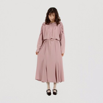 日本進口面料復古粉色燈籠袖寬松系帶短袖圓領連身裙