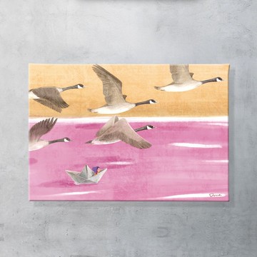 |作品故事|有時候,我們都需要一片屬於自己的寧靜湖面。這幅作品描繪一位小小旅人,乘著紙船,在粉紅色的湖上前行。天際有雁子相伴,湖面倒映著柔光,抬頭,看見飛翔的夥伴,在這流動的旅程裡,我也正慢慢學會飛。|關於創作者|「9cm zoo」是一個以動物角色為主角的插畫品牌,由設計師 Dora 以角色「一首獅」視角創作,作品以旅行與內在對話為主題,結合詩意色彩與情感故事,讓每一幅畫都成為一段溫柔的陪伴。---------------------------------------------♥ 尺寸: 正方形 (15×15x 1.5 cm) 附魔術黏土♥ 尺寸: 2F (25.5×17.5x2 cm) ♥ 尺寸: 4F (33x24x2 cm) ♥ 尺寸: 5F (35x27x2 cm) ♥ 尺寸 2F~5F 附小朵耳三角掛勾及掛繩♥ 產品材質: 熱昇華油畫布輸出/木框------------------------------------------**您的牆面,是否符合藍丁膠的要求?** 使用前,請取出1小塊藍丁膠粘貼牆面,測試您的牆面是否會出現掉漆、掉皮的情況,出現掉漆掉皮的則您的牆面不適合藍丁膠的安裝, 如不掉漆掉皮牆面則適合藍丁膠的安裝。取下時,需要慢慢施力,將鐵皮畫先取下,然後再將藍丁膠搓下來,注意不要直接拉扯。如何將小尺寸無框畫(15x15cm)佈置在牆壁?https://live.staticflickr.com/65535/51967209857_dd6362ef09_c.jpg1.將附贈的黏膠土分成等份,在手中先搓揉成一球,再分別黏在相框背面木框上。2.先清潔牆壁上的油漬與灰塵(漆若斑駁不建議使用)。 3.將已經黏好黏膠土的畫放置在適當的位置,稍微推擠複製畫背後的黏膠土5秒,讓粘土在牆壁與畫中間延展,發揮黏貼的功用(黏貼於粉刷壁面,取下有可能會將漆一併黏起掉漆,請斟酌使用)。------------------------------------------★注意事項:-印刷商品螢幕上略有色差,顏色以實物為準。-若運費選擇郵寄,我們是透過中華郵政寄出,請再留意地址是否有人能簽收,避免無人簽收被退回,產生運費的損失噢!注意事項:★印刷商品螢幕上略有色差,顏色以實物為準。