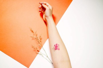 渲染的紅 一點一點的落在玫瑰花上不走復古風 只要清清淡淡的線條https://c1.staticflickr.com/9/8340/29294053532_58108b44ef_b.jpg-------------------------------------------------內容物:手繪玫瑰花紋身貼紙 2入 。尺寸:寬3.5cm、高4cm。-------------------------------------------------使用方式:1. 剪下需要使用的紋身貼紙。2. 清潔並擦乾肌膚。3. 撕開紋身貼紙上的透明膠膜。4. 將圖案面朝下緊貼選定位置之皮膚上,貼上後請避免移動或重複定位。5. 取一衛生紙折成四分之一並確保衛生紙全部吸水。6. 使用大面積吸滿水的衛生紙,完全沾濕紋身貼並輕壓20秒。7. 輕輕撕去背紙後,將肌膚上多餘水分吸乾。清除刺青貼紙 : 將嬰兒油或眼唇卸妝液倒在化妝棉上,敷於圖案上約20秒後,適當的搓揉、擦拭將其去除。產品維持時間:需視產品圖案大小及黏貼處,2-5天不等。提醒:如有紅腫、過敏等不適,請立即停止使用。本產品因盡量避免貼附於易摩擦之肌膚處。產地/製造方式台灣製造