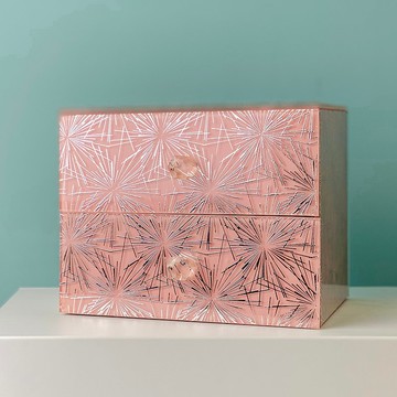 .表面浪面玫瑰粉及金色線條玻璃,背面帶鏡面.二層抽屜式可收納喜愛的小飾品尺寸: H16cm*W12.5cm*D11cm- 一般安全氣泡加紙箱包裝出貨,無專用禮盒。