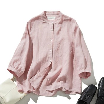 上質純麻七分袖襯衫 自然風透氣百搭 寬鬆版型 淡粉色 240503-4