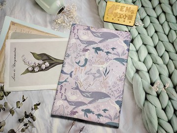 海洋系列-美國限量薄棉布料夢幻淡紫海洋鯨魚布書套-布書衣A5/25K
