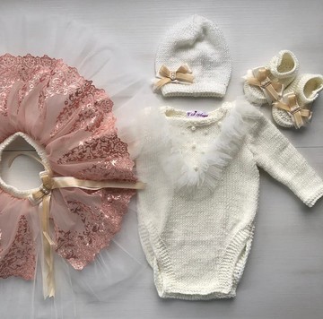 為女嬰手工製作的針織服裝套裝。帶珍珠和薄紗的象牙色連身衣、帽子、短靴和蕾絲芭蕾舞短裙。可作為家居裝束、迎嬰派對禮物、生日套裝、嬰兒照片禮服。如需其他尺寸或顏色,請隨時與我聯繫。用對寶寶的愛來製作。