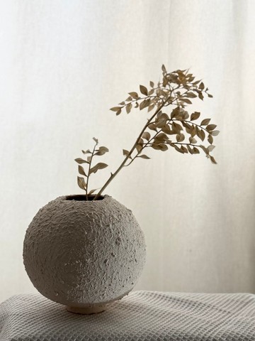 50027 - 月礫 / Moon Pebble如漂浮於夜色中的一顆靜謐之月,以黃陶手捏而成,覆上白泥釉,如月光落於土地。表面保留自然肌理與指尖痕跡,映照出侘寂美學中時間與不完美的詩意。圓形輪廓,簡約質樸,適合植入一株小綠,亦能靜靜地存在於空間中,如夜裡的一道白光。作品名稱:月礫 / Moon Pebble數量內容content :一個花器無其他附件。one vase without other accessories.尺寸Size:寬W11.5 x 高H11.5 x 瓶口top width 4 x 圈足寬bottom ring W 4 x 圈足高bottom ring H 0.8 cm重量weight :489g風格Style :侘寂風、自然手作風、極簡風 Wabi-Sabi, handmade natural style, minimalist用途Uses:小盆栽、藝術擺件 planting , decorative object材質Material : 黃陶yellow clay 白泥漿釉面 White mud glaze Code :W50510-4101⚠️請留意:手工作品有不規則、顏色不均、表面粗糙、流釉等特殊魅力,若有任何問題歡迎請來訊詢問。⚠️親愛的來自國外的朋友們,全球運輸提供安全包裝。歡迎隨時與我們詢問運費相關事宜。⚠️Please note: Handmade works have special charms such as irregularities, uneven colors, rough surfaces, etc. If you have any questions, please feel free to inquire.⚠️ Dear friends from abroad, Global shipping available with secure packaging. Please feel free to contact me for inquiring the shipping cost.