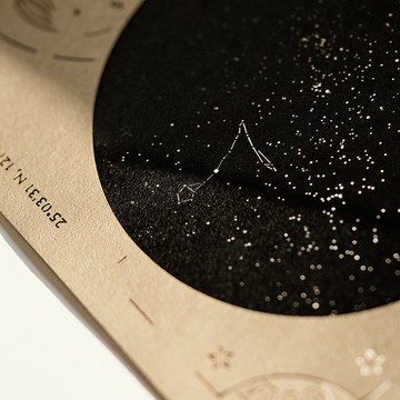 星座系列卡片-雙魚座生日卡 / 紀念日 / 問候卡客製化雷射雕刻,完全無印刷可將日期(年、月、日)與地點(某縣市、地標或座標)雕刻在卡片上並在星盤上鏤空雕刻出特定時間地點的星空對著光源,就像看見星星在閃爍書寫部分是嵌在內層的象牙白星辰紙,包裝內含三張書寫用紙也可以自己裁切 87x147mm 的紙張嵌入背面黑卡即可紙材:星幻紙 / 180磅黑卡 / 星辰紙