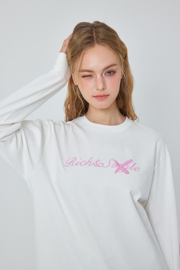 與 Rich & Single New York 合作推出的經典設計。這款純白色長袖T恤胸前綴有粉色「Rich & Single」簽名字體刺繡,簡約卻不失高雅,營造出細緻柔美的對比感。選用柔軟舒適且耐穿的面料,不論白天穿搭或夜晚造型都合適。可搭配裙裝或牛仔褲,打造輕鬆時髦的穿搭風格。