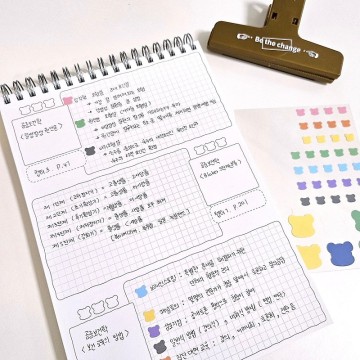 規格 l 148 * 210 (mm) A5尺寸頁數 l 100THIKNESS l 180克高級紙我想製作Horam的第二張清單主題是摘要筆記/小備忘錄/日記筆記/錯誤回答筆記等可以像照片一樣使用的萬能筆記本一樣用於各種目的的筆記本。在一邊分爲3個區域,在一個區域可以寫上題目、日期、內容等,而且區域比圖片大,所以可以寫很多文章。它也可以用作摘要筆記本或簡短日記。因爲是比覈對表更大的紙幣,所以製作150g的話會變成薄紙幣,所以用比覈對表紙幣稍厚的180g高級紙製作,即使貼紙變厚,也可以用大而鬆的環子緊緊地覆蓋紙幣。爲了減少左右手的不便,恐怖筆記的裝訂方向是向上,便於記筆記。設計紙封的PP封皮爲雙層,以保護紙幣