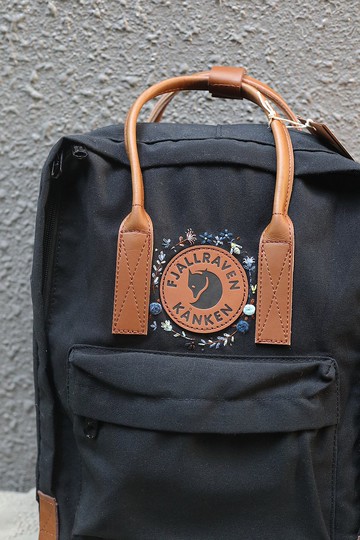 粉橘色花環主題--kanken全黑色包--手工刺繡設計訂製