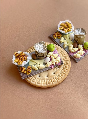廚房縮影(烹飪百吉餅)。微縮模型以 1:12 的比例製作。所有零件都用膠水固定。聚合物塑料、壓克力塗料、壓克力清漆、紙張和織物被用作製造材料。價格為 1 件。