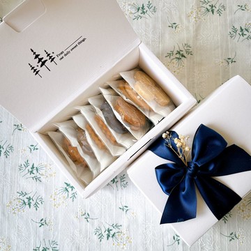 | 澎湃手工餅乾禮盒 | 禮盒尺寸|11.5 x 8.5 x 18.5cm禮盒包裝|緞帶與乾燥花材,(花材依季節隨機出貨)內 容 物|八款餅乾蔓越莓酥脆餅、蜂蜜莓果燕麥餅、特濃巧克力餅乾、梨山烏龍茶餅乾、玄米米香餅乾、甘梅地瓜薄脆餅、布列塔尼薄脆餅、薰衣草小酥餅。----------------------------------------------彌月訂購優惠、大宗訂購優惠、異業合作,請私訊粉絲頁,謝謝。 ------------------------------------------------|關於食材|蔓越莓酥脆餅:發酵奶油、牧場黃金蛋、砂糖、聯華麵粉、蔓越莓、玉米片蜂蜜莓果燕麥餅:發酵奶油、牧場黃金蛋、砂糖、聯華麵粉、燕麥片、蜂蜜、蔓越莓、綜合堅果特濃巧克力餅乾:發酵奶油、砂糖、聯華麵粉、巧克力、香草精梨山烏龍茶餅乾:發酵奶油、糖粉、聯華麵粉、瑞穗鮮奶、杏仁粉、烏龍茶粉、杏仁角玄米米香餅乾:發酵奶油、糖粉、聯華麵粉、瑞穗鮮奶、杏仁粉、玄米茶粉、米香窯烤地瓜薄脆餅:發酵奶油、砂糖、聯華麵粉、瑞穗鮮奶、窯烤地瓜、甘梅粉布列塔尼薄脆餅:發酵奶油、糖粉、聯華麵粉、瑞穗鮮奶、杏仁粉薰衣草小酥餅:發酵奶油、糖粉、聯華麵粉、法國薰衣草乾--|關於內容|蔓越莓酥脆餅2片、特濃巧克力餅2片、蜂蜜莓果燕麥餅2片、梨山烏龍茶餅乾2片、玄米米香餅乾2片、甘梅地瓜薄脆餅2片、布列塔尼薄脆餅2片、薰衣草小酥餅3片。--|關於包裝|雙入餅乾包裝,共8包,以品牌白色禮盒包裝,含緞帶與乾燥花,若需提袋請選附提袋品項--|關於保存|-餅乾們:常溫保存20天--|關於運送|黑貓常溫宅配,週日宅配沒有營業,若需求週一到貨,會提前週六寄出噢!例:指定02/17(一)到貨,會提前02/15(六)出貨。 超商取貨,運送時程約3-5天,我們會在指定日期前5天寄出。例:指定02/17(一)到貨,會提前02/13(四)出貨。超商取貨的部分,我們在包裝上會盡量做好保護措施,但餅乾依舊會有破碎的風險,若非常在意餅乾完整度,建議不使用超商取貨。