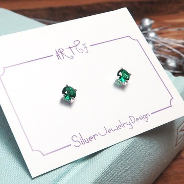 翡翠綠 圓形純銀 4mm 單鑽耳環 爪鑲 925純銀 女生耳環 男生耳環