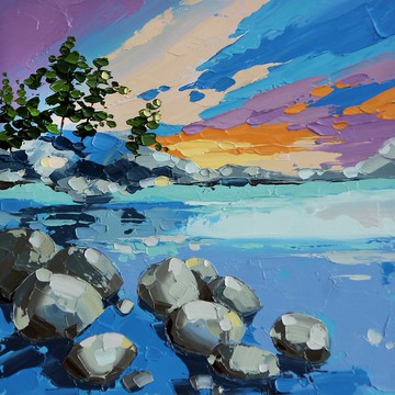 太浩湖风景画 原创艺术 浮雕艺术品 加利福尼亚墙面艺术特点镶板油画原作。标题: "塔霍湖》风景油画。手工艺术品。- 可无框架使用。- 尺寸:25x25 сm (10x10 英寸)- 材料:画板、油画颜料、画笔、调色刀、清漆。- 订单处理时间为 2-3 个工作日。- 交货时间为 2-6 周。- 包装可靠。- 送货时提供跟踪号码- 请注意,图片中的颜色可能会因显示器设置不同而有所差异。