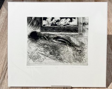 蝕刻(Etching):凹版印刷的一種,首先在金屬板加上一層耐酸保護層,然後將圖案刻在表面,露出底下的金屬。將金屬板放入酸浴後,外露的刻痕會被酸腐蝕。洗掉保護層後,板上會留下圖案的刻痕,可供塗上油墨和以印刷機印刷。蝕刻線條沒有毛邊,成品的線條俐落分明,與直刻版畫不同。藝術家:Robert B. Muirhead名稱: 午睡女人NAP IN THE AFTERNOON(A.P)。編號:AAF 87。尺寸:39 X 34.2 cm。內框尺寸 : 25 X 20 cm 。備註:卡紙托底**老件難免有歷史痕跡,如圖顯示, 能接受者再購買