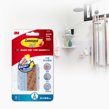 【3M】18063C 無痕防水小型膠條◆使用3M獨家專利無痕防水膠條,免鑽釘、不殘膠、超越吸盤持久力。◆無痕防水膠條不怕水氣,能在嚴苛的環境-10度~50度溫度,相對溼度90%內持續黏貼。◆即使在居家浴室/廚房的環境下依舊可以牢牢貼住牆面,不易脫落。◆新的穩固專用棉片,三重效能升級!抓壁力up/等待時間縮時/承重更重。◆抓壁力up:適用於更多樣化的磚面,連微凹凸磚面都可使用!◆全新小型防水膠條承重效果再升級,單片膠條 450g承重,輕鬆收納各式浴室用品。◆等待縮時:配合穩固專用棉片,潮濕環境下,等待時間縮時為6小時;乾燥環境僅需1小時。★本商品屬消耗品,一經拆封使用,恕無法辦理退貨★◆型號:18063C◆內容量:8片小型防水膠條 +1 包穩固專用棉片->本組合共含6組◆承重:450g◆尺寸:100*15*170 mm◆重量:17.5g◆產地:美國◆效期:3年◆產品條碼:4710367432548