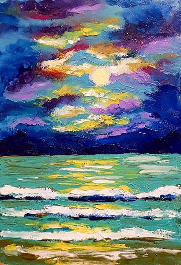 原創風景畫,月夜油畫,寧靜畫作,油畫,海景畫