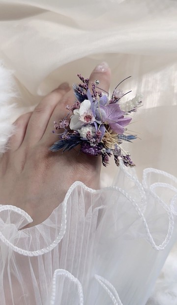 浪漫夢幻 紫色乾燥花手花「紫色,是浪漫與夢想的顏色。這款紫色乾燥花手花,選用繡球與滿天星,搭配細緻的手工設計,營造如童話般的氛圍。它不只是飾品,更像是一種心境 ——提醒我們,即使在平凡的日子裡,也能為自己添加一點夢幻,活成自己喜歡的樣子。」商品特色:\t•\t以薰衣草紫為主調,搭配不凋繡球、滿天星與小珍珠,呈現夢幻氛圍。\t•\t清新紫調與白色花材交錯,增添活潑與少女感。\t•\t適合喜歡浪漫、童話氣息的妳,搭配禮服更加迷人。適用場合:✔ 新娘或伴娘飾品✔ 浪漫約會、寫真拍攝✔ 禮服與舞會造型商品規格\t•\t尺寸:戒面約 4-5 cm\t•\t材質:乾燥花材、珍珠、不鏽鋼戒圈(可調整大小)\t•\t包裝:附精緻禮盒,適合送禮或收藏 **【運送方式】**❗️花材本身較為脆弱,開箱如發現少許花屑掉落屬正常現象。因花材和花器為易碎物,超商物流品質參差不齊,所以推薦您選擇賣家宅配,開箱時可錄影存證,以利保有任何運送問題,能互相保障自身權利,感謝您。 ‼️ **【注意事項】**‼️ • 商品依款式色系製作,有時應花材短缺,會選擇適合的替代花材。\t•\t乾燥花飾品皆為手工製作,每件皆獨一無二,無法完全一模一樣。\t•\t因拍攝光線及螢幕顯色不同,可能會有些微色差。 **【訂製事項】** • 每件花品為純人手製作,固存在微細調整及手工痕跡為正常。 • 特別訂製色調請聯絡設計師,由買家提供色板。每一特別訂製色調將加收 $80手工調色費用。 **【關於水晶花、乾燥花/永生花】**💐**水晶花**主材質為樹脂,細銅線。做工方式⚜️銅線拉形➡️樹脂成膜➡️調色➡️組裝成形🚫切勿過度反覆屈曲以致花品折斷或破損。💐**乾燥花**保存約半年至一年,不调花/永生花約1-3年,依保存狀況。乾燥花請放置在乾燥通風處且無太陽直射的地方,可延長保存期限和保持良好花況,請勿澆水。乾燥花和永生花隨著時閰褪色和凋謝,皆為正常狀況。💡若有疑問可在聊聊詢問,感謝您。