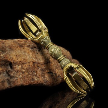 收購自海外藏家.年份定位在19世紀.百年歷史宗教文物.5股分張開口.早期憤怒杵的形制.全長13.5公分.重151公克.黃銅合金.手工雕刻修整.實修有年代的法器..百年以上古物.此杵一協股有鑄漏老錫補.*********************************至於法器的磁場感應.本人沒有感應體質.不管是西藏古老的普巴杵.金剛杵...甚至是日本東密的獨鈷.3鈷.5鈷杵...也完全無感.但今年大量收西藏杵時順帶收入幾把日本杵.有一晚把玩一把獨鈷杵.睡前順手放在枕頭下睡覺.想不到晚上夢到火供場景..聞到火供燒松香樹酯的味道.因為這幾年常燒破碎的琥珀蜜蠟念珠給朋友聞.讓朋友們學習蜜蠟琥珀真品燃燒後的味道...在夢中還特別仔細聞...連續3次...因此夢裡確認真的是松香蜜蠟這類樹酯燃燒的味道...醒來天亮....30多年來..手摸無數法器...都是無感遲鈍..竟能從這把獨鈷杵得到夢中感應....南部文物同行曾說:日本修行人的念力超過西藏人.別小看日本法器...2024年12月7日一個長期靈修禪坐的道教師兄來訪.感應過我手上多件法器...不管西藏(11-18世紀)或日本的老杵....上手後都讓他止不住的呵欠連連.無法停止..直呼磁場好強大...然後一臉不可置信地看我...說我摸這些法器都沒感覺嗎???他感應完還拍照傳給他的師父看...再聽我跟他解說每件法器的年代及收購價格...隔天一早不好意思地請求我出讓3把日本東密法器(獨鈷.3鈷.5鈷杵)給他..因為日本法器跟西藏法器感應的磁場幾乎同樣強大...但價格差距極大...如同西藏天珠跟西亞珠價格差距...應該算過日本法器價格還請得起吧....2024年12月19日專程北上來找我.跟我報告說.這日本法器他帶回家當晚.放了2把在床頭櫃旁.就在夢中看到杵裏有大小2隻神龍出現…他修感應多年…這次真的驚喜很大…**********************************2024.12.18去道場供養上師烏金堪布.詢問藏傳佛教有無修3鈷杵的法門.上師說.只有在家的瑜伽士觀修.僅是觀修...用觀想的修法...觀想3鈷杵在嘴裡...實際上是沒有用到3鈷杵的法器.9000-114.03.01