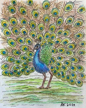 《孔雀雀》14x18厘米,2022年紙、水彩筆、中性筆(需要一個框架掛在牆上)藝術家 - 阿納斯塔西婭·庫爾幹諾娃環保運輸包裝(回收材料)