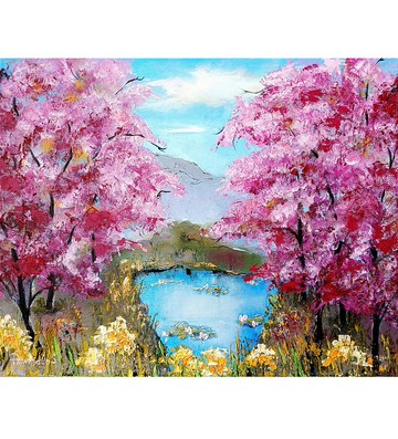 櫻花畫春天油畫原作 Chlossoms Painting Spring Landscape Original Art Park Alley