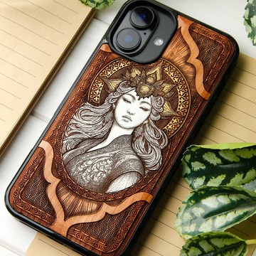 天照大神 - 手機殼木質雷射雕刻+手繪