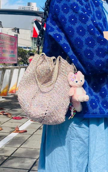 商品如照片,粉、藍、白、絢彩白,均是閃亮的線材編織而成。可手提、可肩背,背袋顏色可更換。購買前請先來信確認顏色。