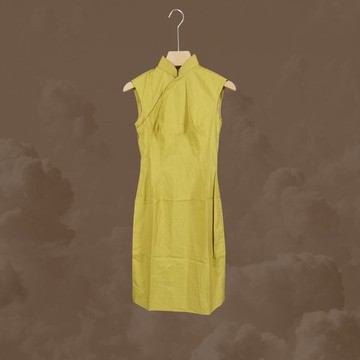 二手 古董訂製 螢光黃色 素色素面 顯腰身 小尺碼 無袖旗袍 CA613
