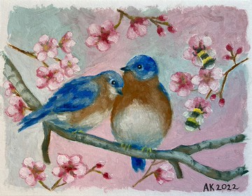 春天的油畫,愛情鳥,蜜蜂,藝術品,花朵盛開,粉紅色