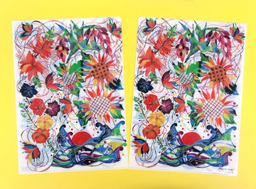 以沖繩傳統工藝「型染 (Bingata)」的技法製作的藝術作品,現化為質感豐富的透明文件夾。畫作描繪了「在石垣島隨處可見的花卉,如扶桑花、月桃、雞蛋花與向日葵,以及牠們周圍翩翩起舞的蝴蝶,彷彿正換上花卉的衣裳般」。* A4 尺寸* 雙面彩色印刷* 本設計受著作權保護。(c) Mayuko Ikema All Rights Reserved.