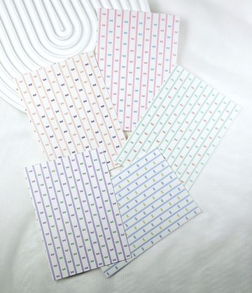 緞帶紋理背景紙材質:描圖紙張數:共20張,5種顏色,每色4張尺寸:8.5 x 13.5 公分*裁切時可能會有5mm的誤差。顏色:藍色、薄荷綠、紫色、粉色、杏色