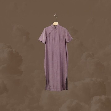 二手 灰紫色碎花 古董訂製 薄短袖旗袍 CA0803