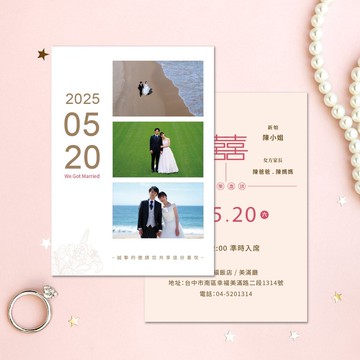 ★下單金額為選擇數量的商品總額例:選擇 30組,產品總價為 $1380★最低訂製量:30組★邀請卡資訊內容可更換成自己的內容,可更換的內容區域,請參考附圖細項。★卡片紙類有星幻卡(285g)、瑞典一級卡(350g)可選擇。★套組含250g厚磅珠光信封(16x11cm),五款顏色可選和3cm囍字圓形貼紙。★印刷及寄送時間:每週一至週五下單,在收到文字資料後會在24小時內跟您確認稿件內容(不含週六日及國定假日),最多可免費調整二次,稿件確認無誤及收到款項後就會送印刷。約三個工作天左右印刷完成既可出貨,不含假日及國定假日。寄出後約2-4天到貨(實際以送貨業者時間為主)。★若有急件請先告知,可先以聊聊詢問。★請下單後將以下資料,用聯絡設計師的功能傳送給我們以便排版及提供校對:1.\t新朗名字:2.\t新娘名字:3.\t新郎家長名字:4.\t新娘家長名字:5.\t新朗英文名(沒有的會以中文名替代):6.\t新娘的英文名(沒有的會以中文名替代):7.\t結婚或訂婚日期 ,例:(2022/09/06):8.\t提供喜宴餐廳名稱、地址、電話、入席時間:9.\t您的PINKOI帳號:10. 信封顏色:11. 貼紙編號:12. 此款請確認所需型號:MA029-1 或 MA029-2, 或 MA029-3, 或 MA029-4, 或 MA029-513. 紙卡種類:星幻卡(285g) 或 瑞典一級卡(350g)溫馨提醒:★每部手機、電腦螢幕顏色顯相均不同,與實品多少會有約10%上下色差,依印刷實品為準。每批顏色也不一定會完全相同,無法以此作為退貨理由。若對成品要求精準度極高的買家,請勿下單。★請買家若提供QR code的檔案,請先檢查完稿及圖片解析度是否ok。若因檔案解析度不足導致印刷品質不良,賣家不負任何責任。若需要幫忙轉成QR code碼,請提供正確連結網址,校對時請確認連結是否正確,若因買家提供錯誤連結網址,導致連結錯誤,賣家不負任何責任~★若有需要另行製稿或設計,可至聊聊詢問,另行報價。★客製商品不適用七天鑑賞期,商品送印刷後,無法取消或退貨。客製化商品因具有排他性(無法再次販售給其他客人),「本商品為客製化內容,下單即代表已知悉並同意不再享有七天鑑賞期」。#婚禮 #邀請卡#雙面印刷 #喜帖 #結婚 #訂婚 #客製化卡片 #邀請卡信封#韓式喜帖#婚紗喜帖