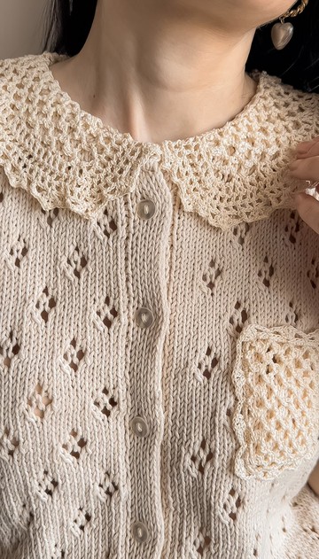 鉤針領蕾絲針織開襟外套,附小口袋,訂製商品顏色(照片所示):436 象牙白模特兒身著 S 尺寸。紗線成分:100% 有機棉。袖子款式:泡泡袖,短版領口款式:圓領搭配鉤針領使用塑膠鈕釦固定。保養說明。請於攝氏30度手洗。請於平面上水平晾乾。
