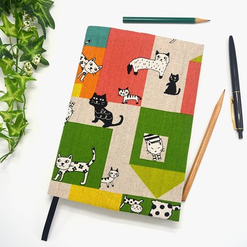嬉戲的貓-黃綠款布書衣/布書套 可調式 日本布