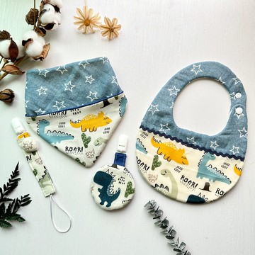 4件組:圓兜+口袋三角兜(口袋可放奶嘴)+奶嘴夾+平安福袋脖圍:可戴至0-3歲材質:日本雙層紗布、台灣棉布花色部分也可私詢詢問更改、挑選花色或加購繡字