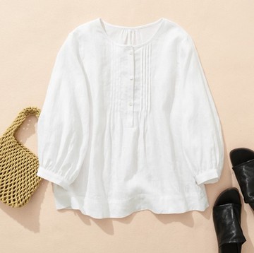 質感亞麻9分袖襯衫 清爽俐落 自然皺褶 輕盈舒適 白色 230515-1這款採用100%純亞麻精心製作的襯衫,以精緻的胸前褶皺設計展現低調的奢華感。寬鬆的剪裁輪廓搭配巧妙的胸線褶飾,讓衣襬自然呈現優雅的傘狀弧度,既修飾身形又散發柔美的女性魅力。特別設計的圓弧袖口搭配鬆緊皺褶細節,為簡約的版型增添一絲俏皮靈動的氣息。隨著洗滌次數增加,亞麻特有的天然紋理會愈發明顯,那種越穿越有味道的質感變化,正是亞麻單品最迷人的特質,讓這件襯衫成為您衣櫥裡會隨著時間累積情感的心愛衣物。在搭配性方面更是無可挑剔,無論是搭配俐落的西裝褲展現專業幹練,或是配上休閒牛仔褲營造隨性風格,都能輕鬆駕馭。亞麻天然的透氣性和吸濕排汗特性,讓您在春夏秋三季都能保持清爽舒適。那些看似不經意的自然皺褶,正是這件襯衫最與眾不同的時尚語言,完美詮釋了「不費力的時尚」的真諦。材質成分: 100%亞麻尺寸:衣長:58cm胸圍:110cm肩寬:40cm袖長:43cm袖口:26cm袖籠:56cm領寬:20cm細節特徵:透膚度:輕微內裡:無口袋:無彈性:無光澤:無適穿季節:春.夏.秋