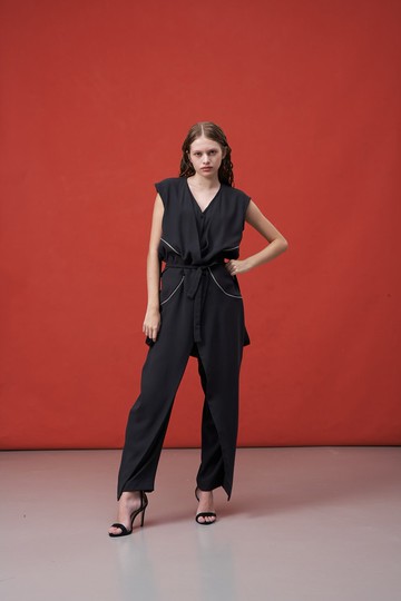 **2025AW《K-U-O-W-E-I》**https://images.squarespace-cdn.com/content/v1/568d0036dc5cb4a5b51b342a/310bf83c-9b06-4bb9-b6d9-a81130083232/INF+SS25+Kuo+Wei.jpg?format=2500w|**設計**|本款假兩件雙層連身褲以未來機能與經典結構交錯構築輪廓,透過解構語彙再造「一件多穿」的可能性。整體廓形採V領無袖設計,藉由X型線條巧妙修飾身形比例,收束腰線、延伸腿部線條,展現俐落有力的中性姿態。服裝採一體式連身結構,剪裁融入西裝老爺褲的筆挺語彙,構築簡潔利落的下身基底,而外層延伸出的擋片設計,於視覺上增添層次與動態張力;腰間設置可調式綁帶,讓穿者依造型需求自由收腰,在鬆弛與利落之間靈活轉換,實現多元穿搭可能。外層腰間擋片配置拉鍊,拆卸後可轉化為一款結構感十足的單肩包,使造型得以在實穿與機能之間自由切換;拆除後,腰間呈現鏤空結構,內層線條隨之顯露,形成虛實交錯的視覺張力,無論靜態或動態,皆展現服裝與身體之間共構的節奏感,實現真正意義上的「服裝進化式穿搭」。本季印花看似暈染、又是煙花,帶有不食人間煙火的一股浪漫感,實則是來自於郭瑋的大腦電腦斷層檢查照片,將照片顯示出的大腦皺摺重新排列、旋轉、模糊後才有了今日充滿浪漫氣息的印花;布花色彩流淌著INF的經典暗黑,輔以靜謐如月光的白與深邃如暮色的藍,交織出一種既神秘又優雅的氛圍,彷彿在現代與傳統之間輕盈流轉,營造出詩意而富有層次的視覺體驗。|**靈感**|設計師郭瑋同名系列。本系列不再只是解構服裝和設計概念,而是將設計師郭瑋的大腦解構;到底是什麼造就了INF這個品牌?透過將郭瑋的腦內容物一一拆解,我們得以窺探郭瑋的台客美學、生活哲學以及他涉略各種文化後不斷翻轉而成的創意巧思,郭瑋與INF是如何將各路文化拆解重塑成一件件的時裝?透過本季度服裝我們得以一一窺見。本季將設計師郭瑋的大腦MRI照片拆解重塑成渲染感的服裝印花,看似迷離卻有言之有物的氛圍正如品牌的抽象解構手法;除了印花之外,本季更是將INF對永續時尚得觀點表現的淋漓盡致,郭瑋認為:舊衣回收與回收再造固然很好,但比起時尚廢棄物產生後的後續處理,他更希望在時尚廢棄物產生前想辦法,於是INF著名的一衣多穿系列在日新月異的更迭後在本季達到頂峰,郭瑋透過設計力賦予一款服飾多種變形穿法,例如:包包變成T shirt、裙子變成褲子;『透過賦予服裝多種樣貌,讓服飾不只是一件時尚單品,除了好看實穿外,我們更希望它能陪同穿著因應各種場合,長久的陪伴消費者,從而減少時尚廢棄物的產生。』INF本季依然遵循”以文化為底蘊,以時裝為載體”的品牌精神,融入許多亞洲以及西洋文化:『我們販售的不只是一件時尚單品,而是生活和文化。』|**材質**|聚酯纖維 100%|**顏色**|黑|**洗滌方式**|可機洗低溫整燙不可漂白不可烘乾**INF 25AW TAIPEI FASHION WEEK**https://youtu.be/x9pboxiPNiQ?si=o2kvyEyXA8K7jZft