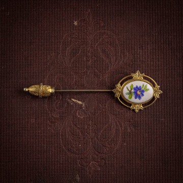 美國古董 印花陶瓷鏤花鑲邊 橢圓領針 一字針 別針