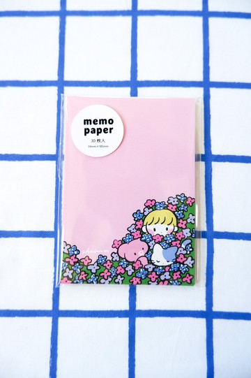 描繪了從花田中探出頭來的小女孩、小熊與小貓的插畫。周圍的背景則是為了記事而全新繪製。由於是A7尺寸,無論是隨手記事或貼在手帳內都相當適合。每張皆可撕下獨立使用。由印刷廠精心印製。尺寸:A7 74mm×105mm紙質:優質道林紙 70kg數量:30張入平版印刷