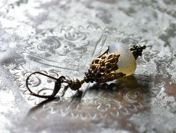 這款單耳耳環,串綴了 Dogon 古董珠、裝飾黃銅、以及隱藏其間的藍色珠飾。那乳白色、圓潤飽滿的半透明珠子,是傳承自非洲 Dogon 部落的古董珠。它們是於 17 至 19 世紀在荷蘭製造的貿易珠。Dogon 部落據說對天文學有著深厚的知識。因此,常能見到如天空般湛藍的珠子,或是如雲朵般澄澈(半透明)的珠子。表面獨特的磨損痕跡,更添一番韻味!(Dogon 珠尺寸:縱 1.1 cm,橫 1.3 cm)我們搭配了擁有精緻鏤空雕花、質感溫潤的黃銅珠帽。在鏤空黃銅珠帽的內部,我們巧妙地藏入了一顆深邃藍色的古董威尼斯玻璃珠。在 Dogon 珠的上下,我們串入了帶有條紋、宛如手毬般的黃銅珠。並將一個稍大的圓環,穿過一個壺狀的黃銅珠。這是一款能夠品味其如燈籠般的美麗輪廓與歲月質感的單耳耳環。【可変更!】.鉤式耳環.螺旋式耳夾(將附贈矽膠套)尺寸長度:約 5.3 cm(含耳飾金屬部分)重量:單邊約 5.8 g材質:玻璃、黃銅