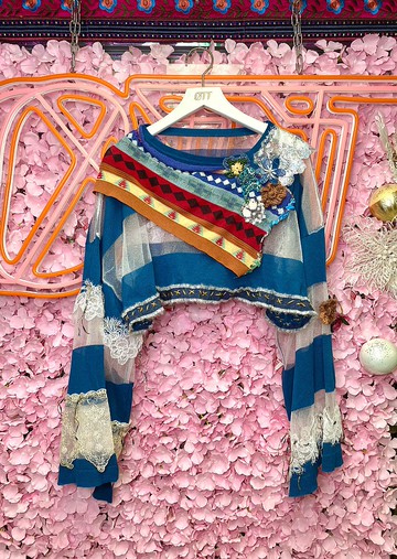 OTT獨一無二•Unique藍色透視橫間編織鈎針裝飾細節闊袖短上衣毛衣