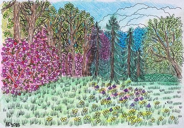 《春天的草地》14x20厘米,2023年紙、水彩蠟筆、中性筆(需要一個框架掛在牆上)藝術家 - 阿納斯塔西婭·庫爾幹諾娃環保運輸包裝(回收材料)