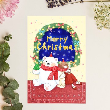 聖誕夜的溫暖祝福-聖誕節可愛插畫明信片-北極熊與女孩