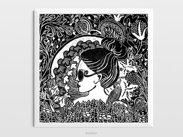 黑花女人 Linocut 印刷植物牆藝術原創藝術品