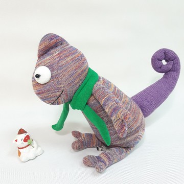 我就是傳說中的變色龍,身上有繽紛的顏色,讓我安心的地生活。身上的領巾由設計師選搭顏色, 不一定跟圖片一樣, 更顯個人獨特風格哦!商品照片為紫+藍+橘色,如果想看其他色,請聯絡設計師。宛茱樂園設計館使用品質好的襪子, 加上創意的設計來製作娃娃,希望帶給客人滿滿的溫暖及歡樂。/ 尺寸 / 坐姿約 23 cm,總長約 31cm(包含腳),尾巴約 25cm(包含捲起部分)/ 材質 / 棉襪,棉花,毛線,其他配件 / 特色 / 純手工製作,做工細,質感好 / 客製化 / 手繡名字中英文擇一為免費,增加字數請與設計師聯絡/ 清潔說明 /每隻襪子娃娃都是手工製作,不建議用洗衣機洗滌,容易造成變形。若有局部髒污,可用洗碗精或中性清潔劑塗抹在髒污處,輕輕用手指或軟毛刷擦拭;若整隻襪娃需要清潔,請務必手洗,以中性清潔劑浸泡後,用手輕輕搓揉或用軟毛刷輕輕刷洗,沖淨泡沫後以洗衣機脫水,再平放晾乾。