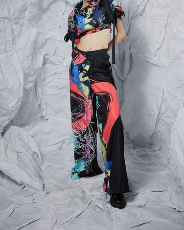**2022SS TRANSLATE**https://images.squarespace-cdn.com/content/v1/568d0036dc5cb4a5b51b342a/f99aac96-f63a-48fa-b64e-61a74256032a/INF+22SS+TRANSLATE.png?format=1500w|**靈感**|靈感來自翻譯與轉換的概念,”將2D翻譯(轉換)成3D,人翻譯(轉換)成魂,恨翻譯(轉換)成愛”;透過翻譯與轉換,讓我們學習到從不同的角度去看待事物,一個事件的本質並不是那麼絕對,而在翻譯與轉換的過程中我們也獲得了一些意外的收穫,不同於生活中的小確幸,而是學習用一種更為宏觀、豁達的角度去看待世界。細節取樣自台灣早期地方信仰與本土妖怪等元素,並與今年12月即將重新登上院線 - 最知名國產動畫-《魔法阿媽》聯名,使用劇中角色酷羅(貓)、小扁(蛇)、Apple(抱著娃娃的小女孩靈魂)等做為素材,並致敬電影剪輯技術「蒙太奇(Montage)」,將角色以拼貼手法融合民俗信仰中畫符的手寫筆觸,打造出滿版且多彩的服飾印花。除了透過時裝展現出台灣在地信仰文化與台灣早期的風土民情外,本季也使用將2D變3D的「Trompe L’oeil」(錯視畫法)的繪畫技法,不斷觀察生活中時裝的光影變化,並以深淺不同的平面色塊重新描繪出《魔法阿媽》劇中角色般的明暗與細節,並運用於服飾印花上,整套服裝穿上後,宛如從動畫中走出的人物一般,看似平面(2D)又看似立體(3D),呼應了品牌本季主題 Translate,翻譯、翻轉出夾藏在平面與立體之間2.5D的韻味,創造出本季富含個性亦帶點可愛氣息的都會時尚印花。 INF品牌不斷地『以文化為底蘊,以時裝為載體』,並透過系列服飾製作重新詮釋台灣古今的多元文化與故事。|**設計**|《魔法阿媽》聯名款 服裝版型上將馬甲與較休閒版型的落地寬褲解構與重塑,提取各自的款式特色與亮點融合成一件件穿法多元的多功能褲型。 版型細節在褲頭上解構出活動式擋片,在擋片上延伸出兩條調節式束帶,可置於雙腿內、外側當作垂吊的裝飾性吊帶來增加個性。將擋片上翻可透過拉鍊變成馬甲型態,兩條調節式束帶圍繞在腰部之間達到若隱若現的神祕感,下翻時則可垂墜成假口袋;另外也在解構出來的擋片加入了日本進口的高手感緞面布料做出材質差異。 印花由最知名國產動畫-《魔法阿媽》聯名,使用劇中角色酷羅(貓)、小扁(蛇)、Apple(抱著娃娃的小女孩靈魂)等做為素材,並致敬電影剪輯技術「蒙太奇(Montage)」,將角色以拼貼手法融合民俗信仰中畫符的手寫筆觸,打造出滿版且多彩的服飾印花。 穿搭上除了搭配品牌經典的解構式襯衫外,也能搭配本季較休閒版型的短袖襯衫;女性搭配西裝外套,不僅把整體視覺比例拉長,也能呈現出一種俐落又有氣場的美感。https://images.squarespace-cdn.com/content/v1/568d0036dc5cb4a5b51b342a/731e8eba-091d-487e-8164-73c37cd655b0/INF+Half+Waistcoat+Wide-Leg+Trousers%29+%288%29.jpg?format=2500whttps://images.squarespace-cdn.com/content/v1/568d0036dc5cb4a5b51b342a/57048203-9686-44bf-a0a6-aa7cf53f118c/INF+%E8%92%99%E5%A4%AA%E5%A5%87%E5%8D%B0%E8%8A%B1%E5%8D%8A%E9%A6%AC%E7%94%B2%E6%9D%9F%E8%85%B9%E5%AF%AC%E8%A4%B2+%287%29.jpg?format=2500whttps://images.squarespace-cdn.com/content/v1/568d0036dc5cb4a5b51b342a/9e24573c-d578-4715-92c5-ce29338a15f0/INF+%E8%92%99%E5%A4%AA%E5%A5%87%E5%8D%B0%E8%8A%B1%E5%8D%8A%E9%A6%AC%E7%94%B2%E6%9D%9F%E8%85%B9%E5%AF%AC%E8%A4%B2+%281%29.jpg?format=2500whttps://images.squarespace-cdn.com/content/v1/568d0036dc5cb4a5b51b342a/ee255cb8-b399-45c4-8fcd-7f7e68f96405/INF+%E8%92%99%E5%A4%AA%E5%A5%87%E5%8D%B0%E8%8A%B1%E5%8D%8A%E9%A6%AC%E7%94%B2%E6%9D%9F%E8%85%B9%E5%AF%AC%E8%A4%B2+%284%29.jpg?format=2500whttps://images.squarespace-cdn.com/content/v1/568d0036dc5cb4a5b51b342a/9d5bf481-2f76-4dbb-a351-ad7249aa8e3e/INF+%E8%92%99%E5%A4%AA%E5%A5%87%E5%8D%B0%E8%8A%B1%E5%8D%8A%E9%A6%AC%E7%94%B2%E6%9D%9F%E8%85%B9%E5%AF%AC%E8%A4%B2+%286%29.jpg?format=2500whttps://images.squarespace-cdn.com/content/v1/568d0036dc5cb4a5b51b342a/764cb6e6-b9fa-4926-8a09-9e8d007a81e2/INF+%E8%92%99%E5%A4%AA%E5%A5%87%E5%8D%B0%E8%8A%B1%E5%8D%8A%E9%A6%AC%E7%94%B2%E6%9D%9F%E8%85%B9%E5%AF%AC%E8%A4%B2+%285%29.jpg?format=2500whttps://images.squarespace-cdn.com/content/v1/568d0036dc5cb4a5b51b342a/bb47afc9-60a2-4dc2-aef9-df0779cde75a/INF+%E8%92%99%E5%A4%AA%E5%A5%87%E5%8D%B0%E8%8A%B1%E5%8D%8A%E9%A6%AC%E7%94%B2%E6%9D%9F%E8%85%B9%E5%AF%AC%E8%A4%B2+%283%29.jpg?format=2500w|**材質**|聚酯纖維|**顏色**|蒙太奇印花|**洗滌方式**|可機洗低溫整燙不可漂白不可烘乾**INF 22SS臺北時裝週品牌秀**https://youtu.be/WwRmhzj5Glo