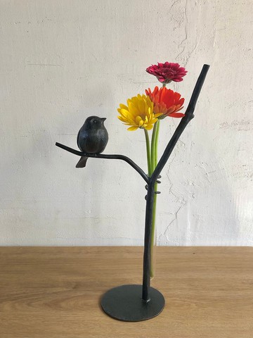 一個鍛鐵花瓶,上面有一隻小鳥棲息在樹枝上的圖案。它是通過錘擊實心鐵製成的。小鳥部分是由三塊鐵板敲打貼上而成。如果在附帶的試管中花痴,就會給人一種樹枝上有花痴的感覺。即使您喜歡花痴但很難插花,這款花瓶也可以讓您輕鬆放置並用花痴裝飾。即使不是在花店買,我覺得也可以摘一些路邊正在盛開的花痴來擺放(注意不要摘太多路邊花痴)。透過佈置各種花卉來享受季節的變化。尺寸 360×220×90mm霧面透明飾面包括試管