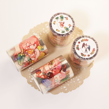 【插畫家潑皮菜菜創作理念】 這次的春、夏主題紙膠帶是以我的原創故事角色「花貓」來做創作,她是一名非常可愛、甜美的女孩子,有著粉色的長髮及貓耳頭飾,喜好穿著裙裝,享受生活的方式就是每天都沉浸在大自然的懷抱跟芬芳裡。 兩卷紙膠帶的設計皆各自有她五套不同季節的造型及搭配的植物、動物、配件,將花貓的日常生活所見所用融入其中,圖樣也可隨意搭配。我喜歡使用溫暖粉嫩的用色來繪製,還有如同童話般的角色,希望能帶給人治癒又充滿正向的暖意,彷彿能從圖中聞到春天的清新花香,或是體會到夏天的明媚陽光。