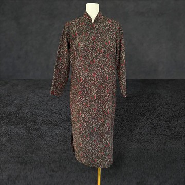 二手 黑棕綠紅配色 印花 微厚挺 古董訂製 長袖 旗袍 PF721